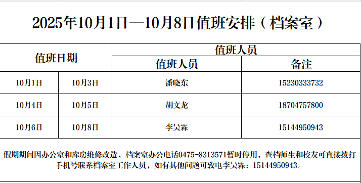 2025年综合档案室十一值班表